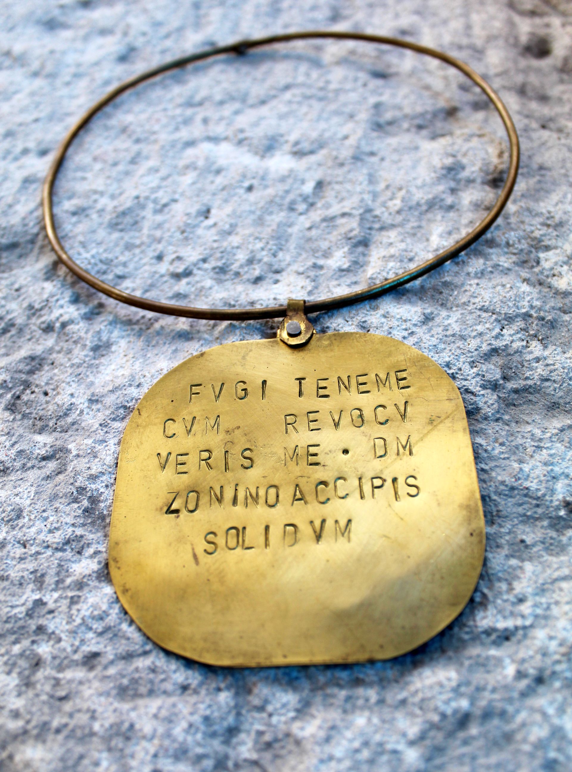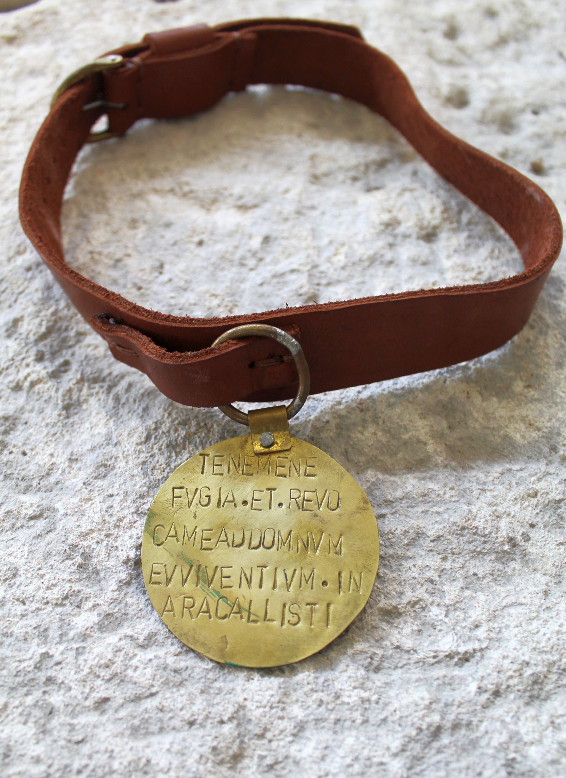 Pe medalioane, de obicei, era trecut un text care menționa proprietarul, îndemnul de a reține fugarul și de a-l înapoia proprietarului, uneori menționându-se și recompensa.
