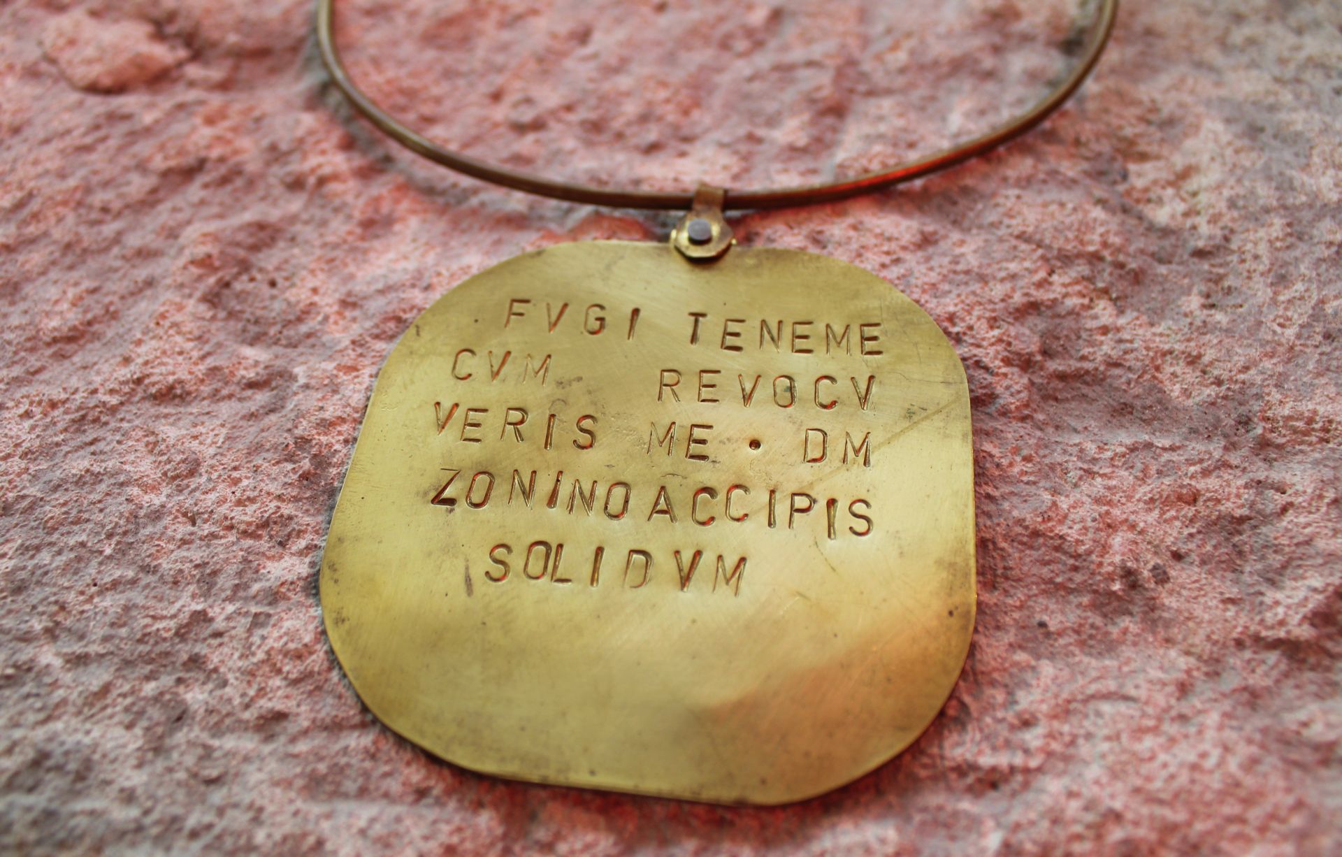 ▪️ ”𝐅𝐕𝐆𝐈 𝐓𝐄𝐍𝐄𝐌𝐄 𝐂𝐕𝐌 𝐑𝐄𝐕𝐎𝐂𝐕𝐕𝐄𝐑𝐈𝐒 𝐌𝐄 𝐃(𝐎𝐌𝐈𝐍𝐎)𝐌(𝐄𝐎) 𝐙𝐎𝐍𝐈𝐍𝐎 𝐀𝐂𝐂𝐈𝐏𝐈𝐒 𝐒𝐎𝐋𝐈𝐃𝐕𝐌” (Reține-mă, am fugit, înapoiază-mă stăpânului meu Zoninus (și) vei primi un solidum)