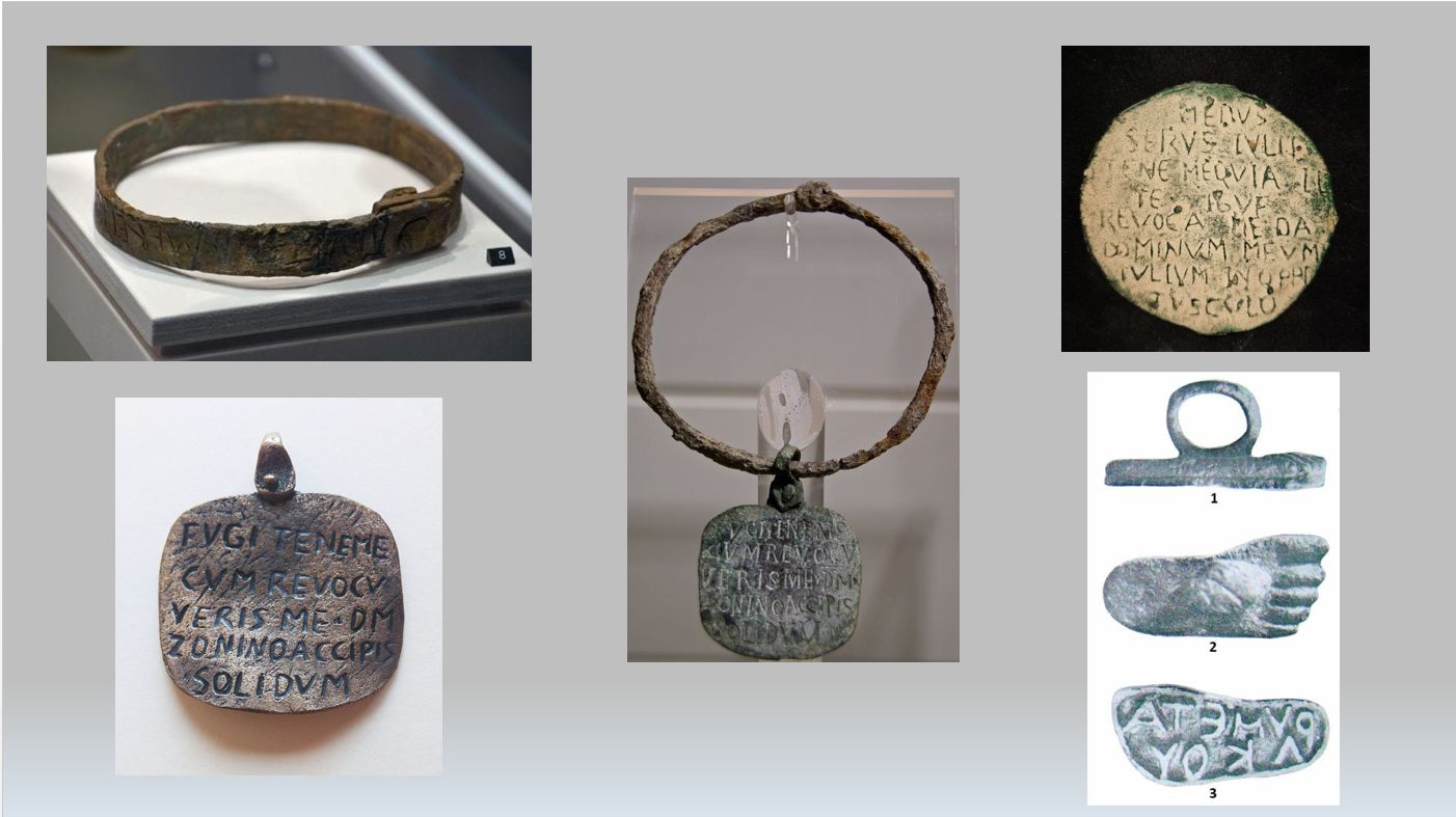 ”Podoabele” acestea erau semnele distinctive pe care le purtau sclavii și prostituatele: colane din fier cu medalioane din bronz, colane din plumb inscripționate, tatuaje sau marcaje cu fierul roșu.
